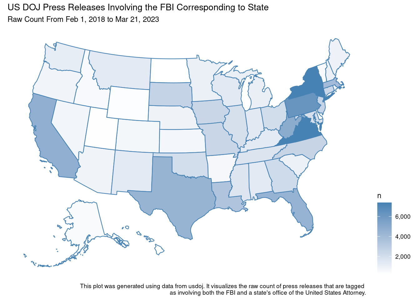 labs(title = "US DOJ Press Releases Involving the FBI Corresponding to State",
