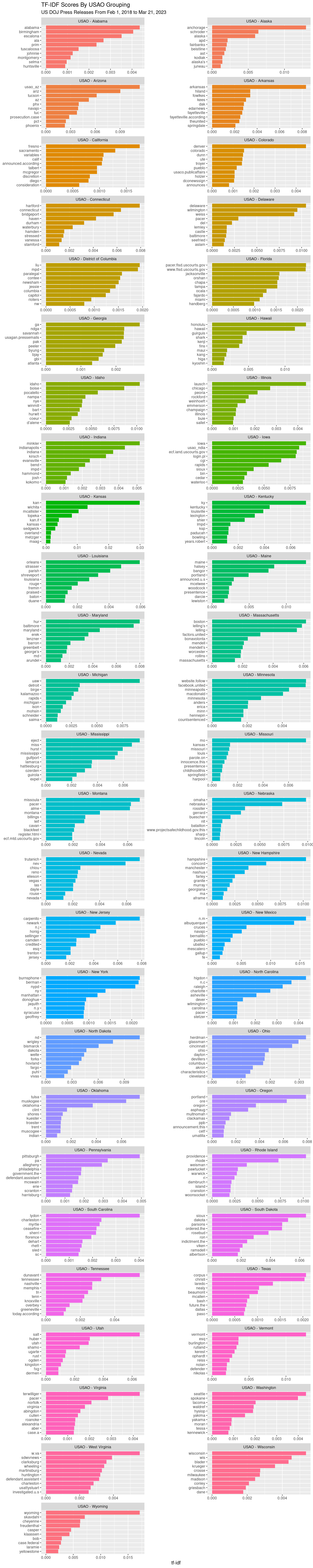 tail(press_releases$body, 2)For this demonstration, we will just compare the words relating to United States Attorney Offices (USAOs) across different states. We will do this by removing mentions of the other divisions from the “name” field and filtering for just press releases that contain USAO as a division.